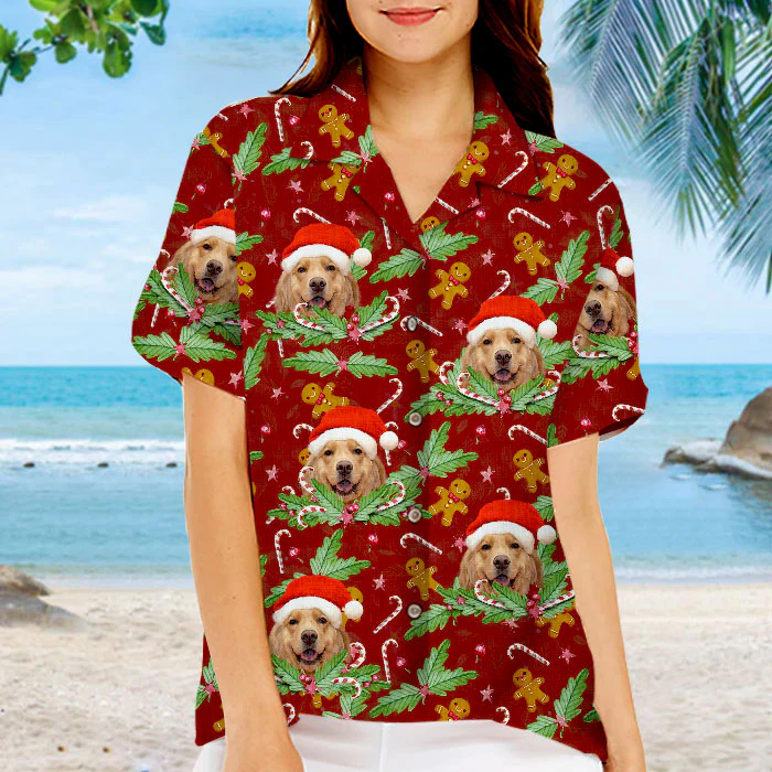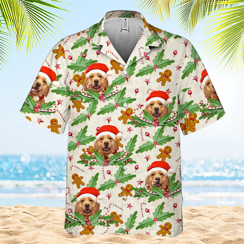 Candy Cane & Gingerbread Pattern – Dog & Cat Personalized Custom Unisex Hawaiian Shirt – Upload Image, Dog Face, Cat Face – Summer Vacation Gift, Gift For Pet Owners, Pet Lovers