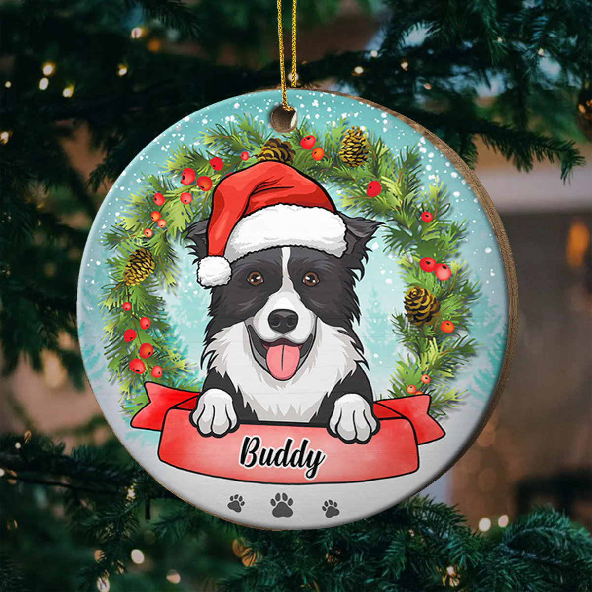 Merry Christmas With The Dog – Personalized Custom Round Shaped Wood Christmas Ornament