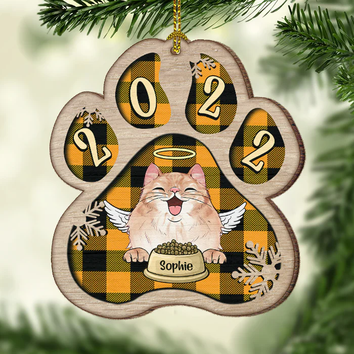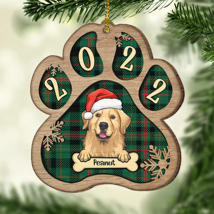 Personalized Custom Paw Shaped Wood Christmas Ornament – Dog, Cat And Snow – Plaid Buffalo Pattern – Customized Decoration And Year Gift For Pet Lovers